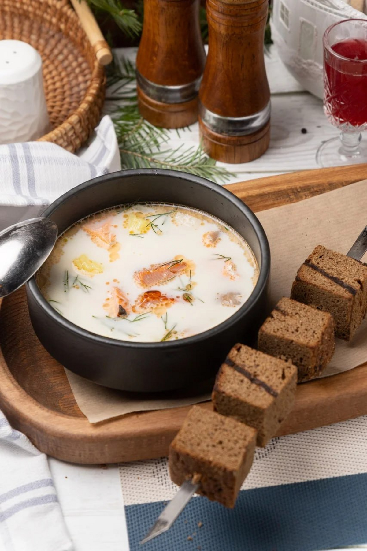 — Уха с шашлыком из бородинского хлеба, форелью и вяленой горбушей из Архангельска;
