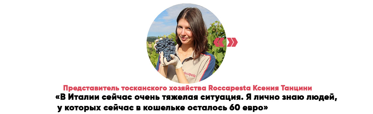 — В будущем возможны экономические проблемы, но мы все пытаемся с этим справиться, сейчас многие хозяйства переделывают сайты, налаживают онлайн продажи. Однако крупных заказов, как раньше, сейчас крайне мало, — продложает Ксения Танцини из Тосканы. — И я сейчас вижу проблему в понижении уровня благосостояния людей. В Италии сейчас очень тяжелая ситуация. Я лично знаю людей, у которых сейчас в кошельке осталось 60 евро. Это люди, у которых какое-то свое небольшое дело, например, бар, которое уже больше месяца закрыто. Все средства вложены в оборот, и нет никакой подушки безопасности. Конечно, эти люди еще не скоро смогут себе позволить какие-то излишества.