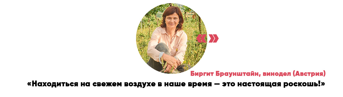 — Мы работаем на виноградниках, так как природа просыпается, и мы не можем ждать. Находиться на свежем воздухе в наше время — это настоящая роскошь! Это действительно так: заниматься любимым делом среди родных лоз, а не сидеть в четырех стенах — за это многие бы сейчас дорого заплатили! — Биргит Браунштайн, винодел (Австрия).