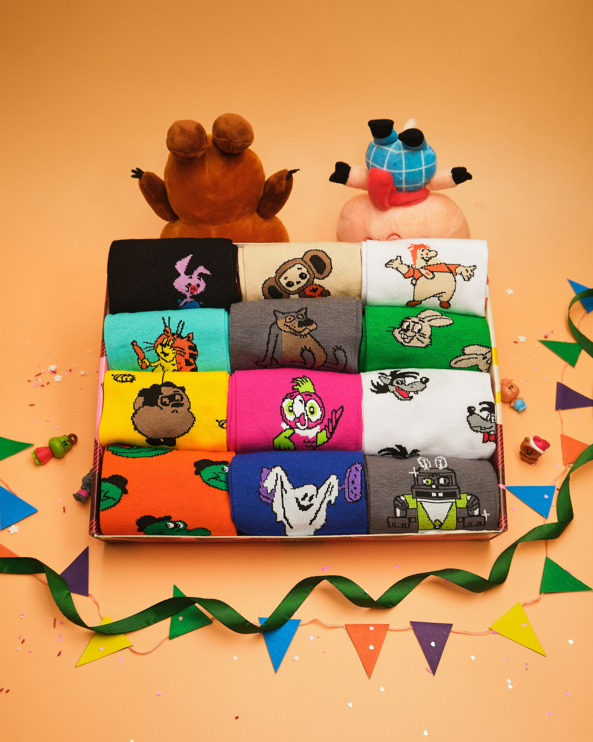 — Мы выпустили коллаборацию с героями Золотой коллекции киностудии. На носки попали Винни-Пух, Чебурашка, Заяц и Волк и другие любимые с детства персонажи. Всего 12 пар и шесть наборов по мотивам шести легендарных мультиков. Не коллекция, а культурный код, — рассказал «Моментам» создатель бренда Сергей Тонков.