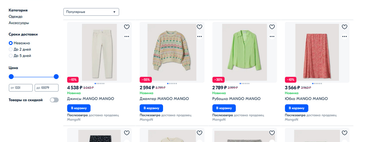 Товары испанского бренда MANGO начали продавать на маркетплейсе OZON. На некоторые позиции даже действуют скидки.