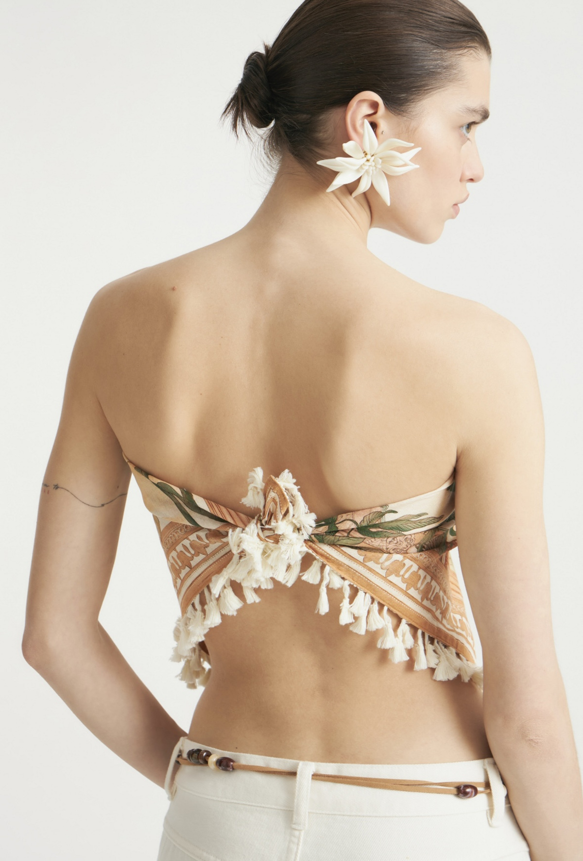Шелковый платок — определенно летний маст-хэв. И вот почему: во-первых, это модно, во вторых — универсально: данный аксессуар можно надеть в качестве банданы, поверх кепки, завязать вокруг шеи или превратить в топ бандо, чтобы носить с бермудами или летящими брюками на вечерних променадах.