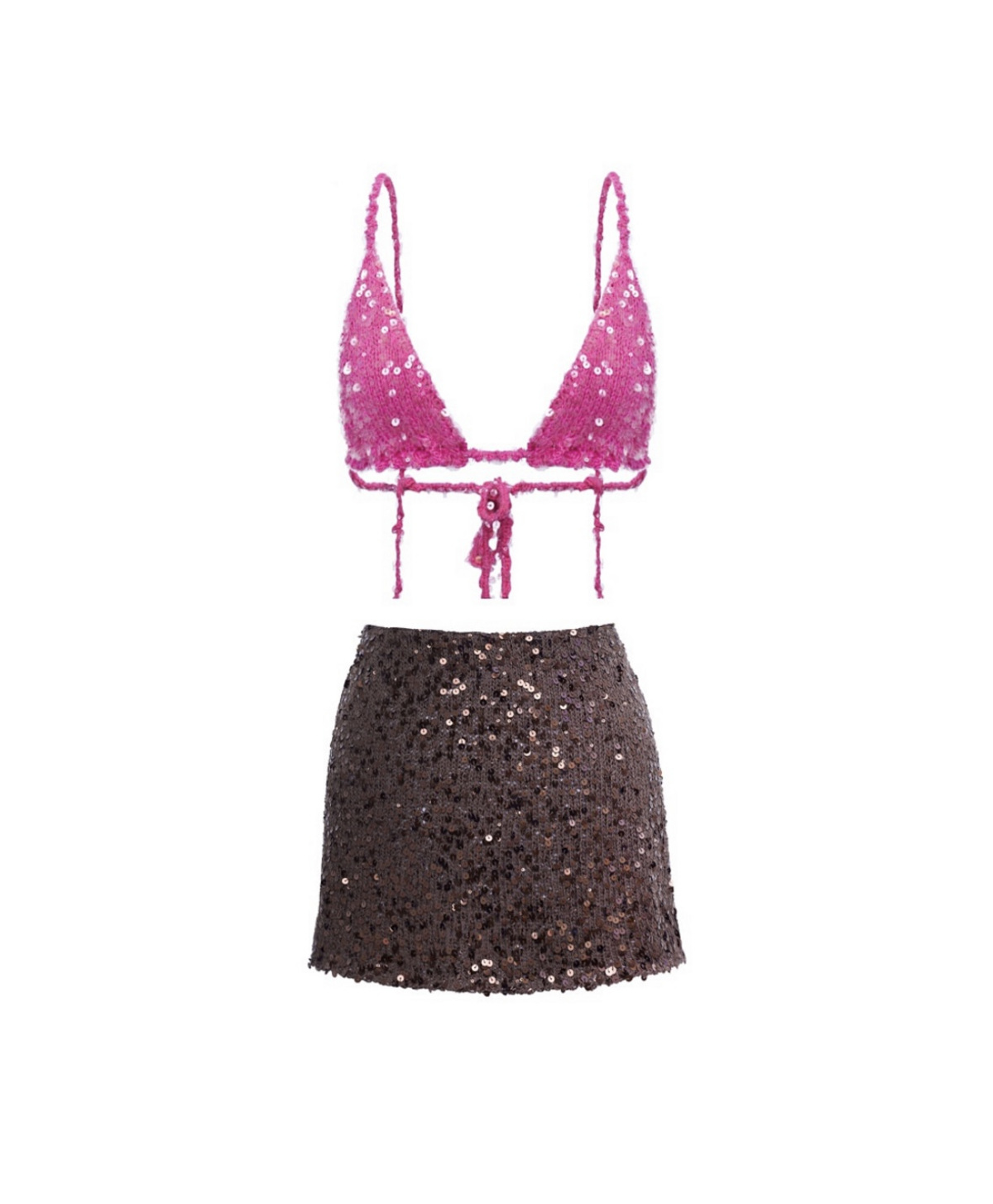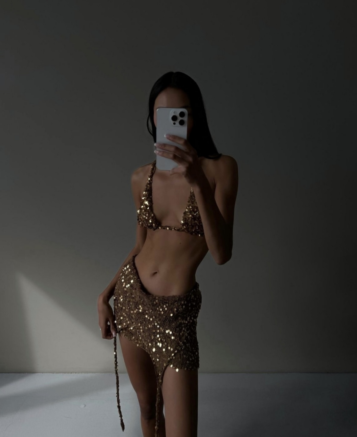 Нарядные купальники с пайетками — то, что поднимет настроение, вне зависимости от того отдыхаете вы на Мальдивах или загораете на дачном участке. Блестящая ткань переливается на солнце, создавая вокруг себя множество солнечных зайчиков. Кстати, верх от такого сета можно надеть на пляжную вечеринку или использовать как первый слой — например, под нейтральный пиджак.