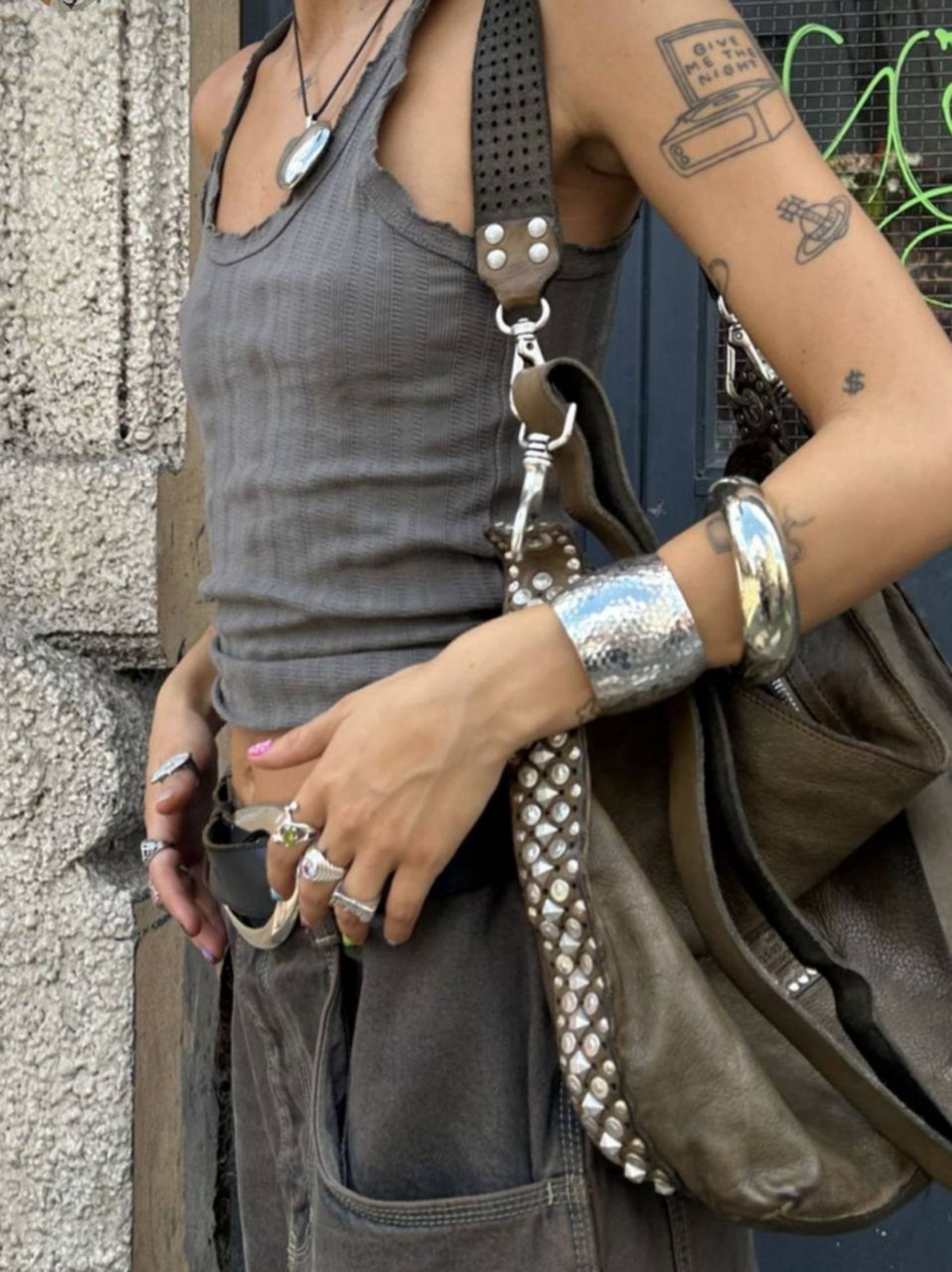 Ремни на низкой талии, балетки с потертостями, по-настоящему «поживший» винтаж, массивные сумки и аксессуары. Любители эстетики не боятся торчащих ниток и «сочетают несочетаемое».