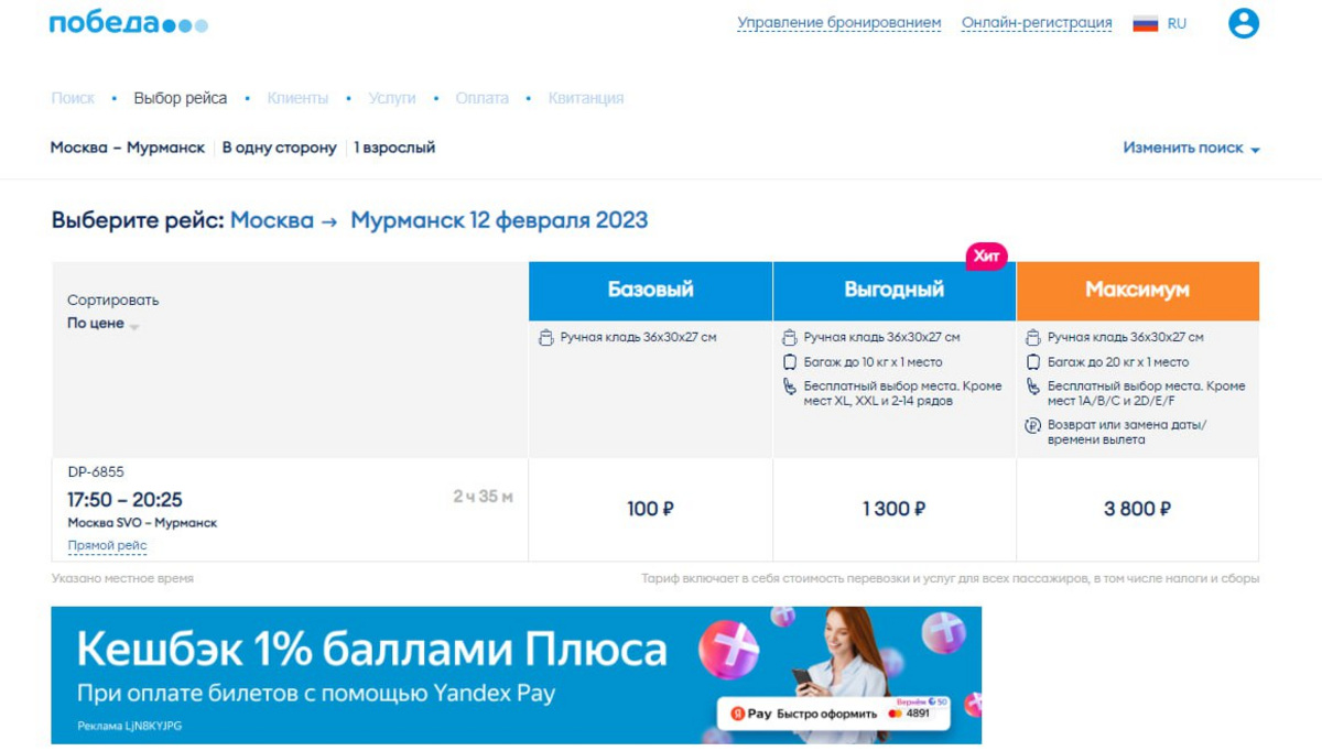 Авиакомпания «Победа» объявила новые направления масштабной распродажи. В рамках акции пассажиры могут приобрести билеты за 100 рублей на полеты по России. Информация об этом появилась в Telegram-канале перевозчика.