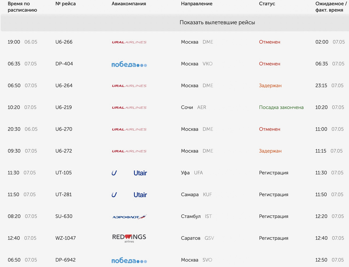 По информации «Уральских авиалиний», временные ограничения, введенные в московских аэропортах с 6 на 7 мая, привели к тому, что 12 рейсов были вынуждены приземлиться на запасных аэродромах, а 17 рейсов задержаны. Стоит отметить, что задержки также касаются направлений в Сочи и Санкт-Петербург.