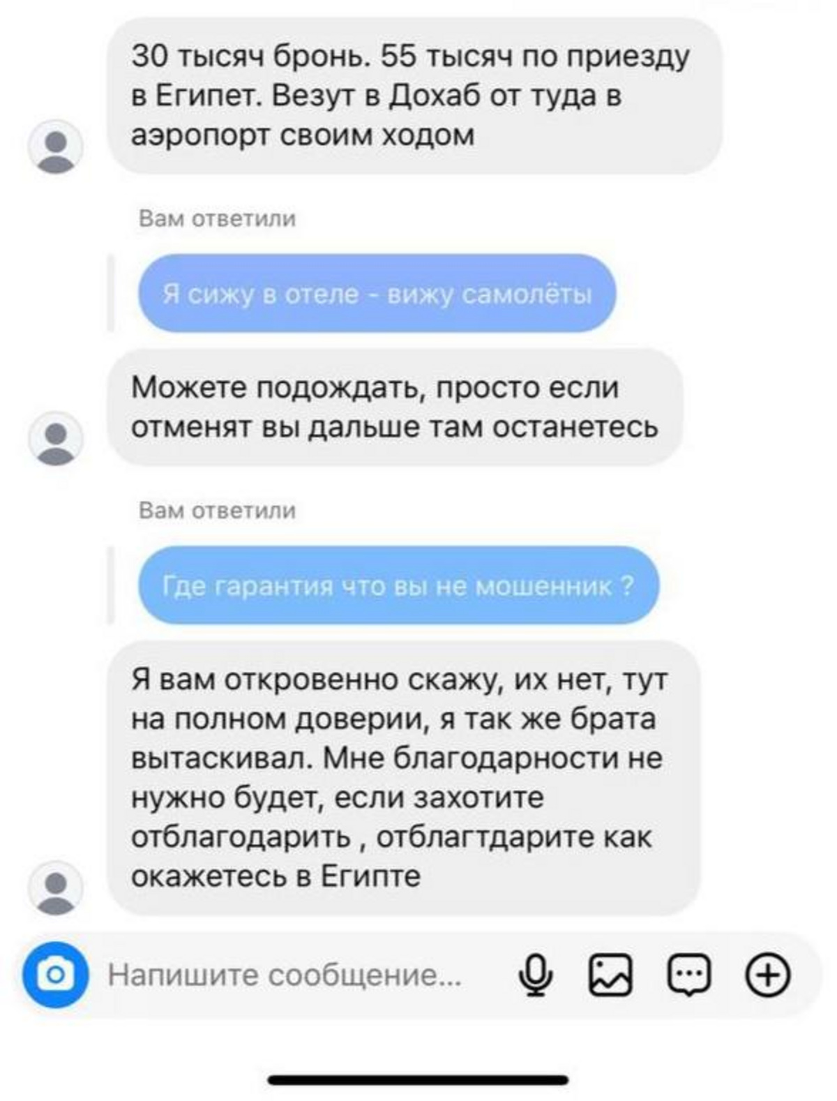 — Мне написал подписчик, у которого нет ни публикаций, ни каких-либо подписок. Предложил помочь вылететь из Египта, но гарантий никаких не предоставил. Также заранее попросил 30 тысяч рублей вперед, а после — еще 55 тысяч, когда я буду на границе. Думаю, что это мошенник и многих сейчас будут пытаться развести подобным образом. Безумие какое-то. Я правда не ожидала, что все обернется такой историей, — поделилась Анна Данилова.