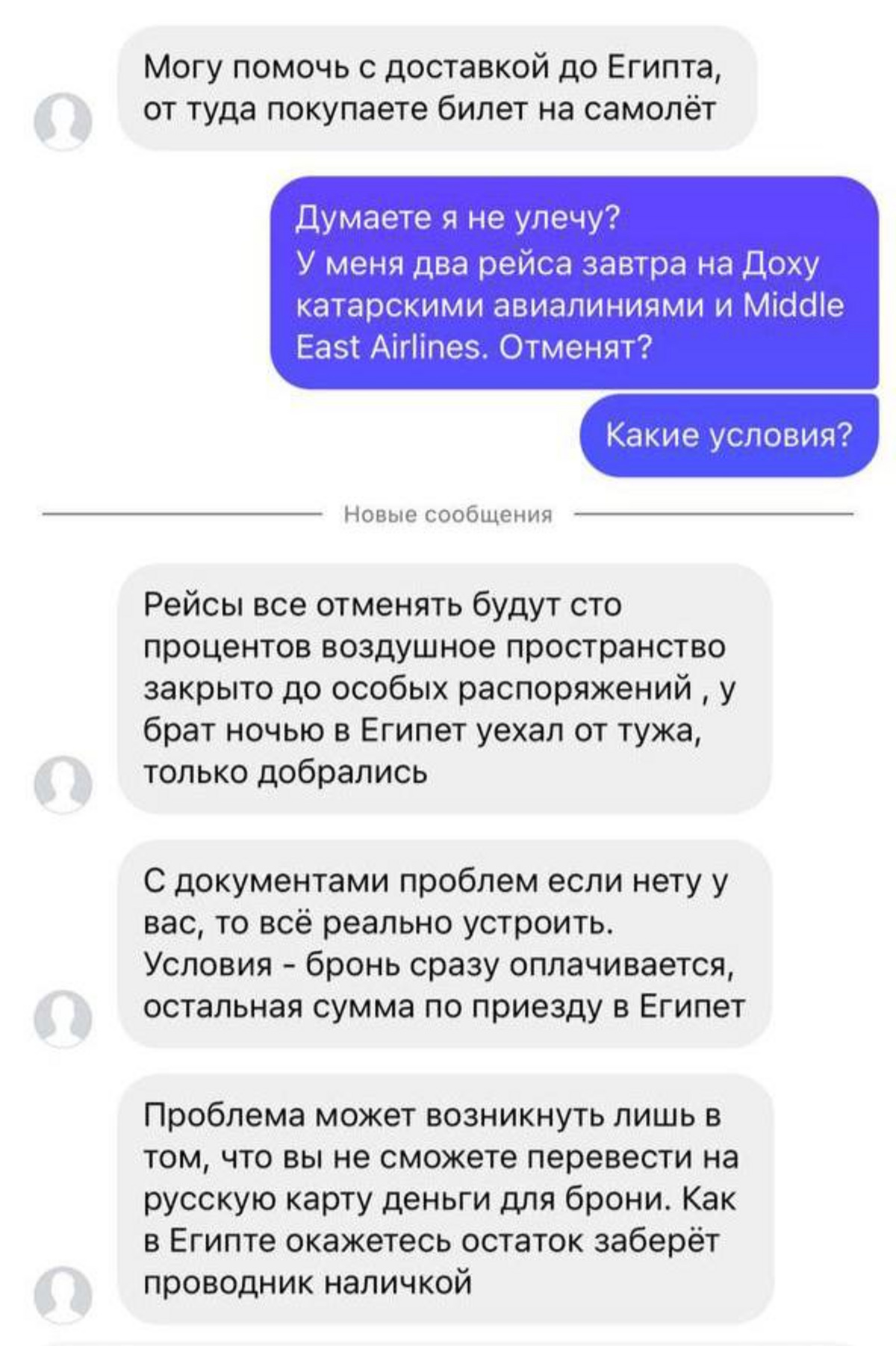 — На всех сайтах есть билеты. Но как только совершается покупка, сразу же приходит уведомление об отмене рейса. Летают только Ливанские авиалинии и Qatar Airways. Весь день я смотрела сайты по покупке билетов онлайн. Сначала я купила билет в Стамбул, после в Анталию. Все рейсы отменили с возможностью поменять только 22 числа. В Каир все продано, — рассказала «Моментам» Анна Данилова.