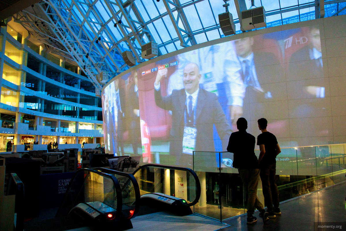 Там на огромном экране, который еще помнит показ Гоши Рубчинского, тоже идет трансляция. Заинтересованного народа немного: несколько пожилых людей, школьники и влюбленные пары. Футбол смотрят молча, чтобы не упустить важный момент из-за пустых разговоров. Но как только в воротах Саудовской Аравии оказывается третий по счету мяч, никто не сдерживается. В зале слышится несколько нецензурных междометий.